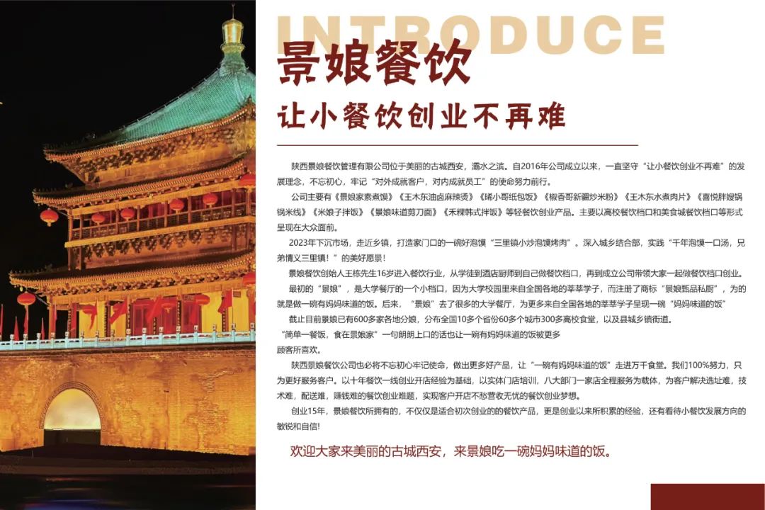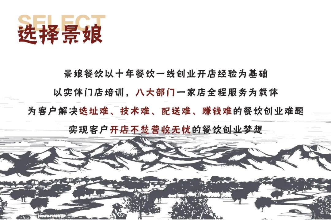 陕西景娘餐饮以十年餐饮*创业开店经验为基础,以实体门店培训,八大部门一家店全程服务为载体,为客户解决选址难,技术难,配送难,赚钱难的餐饮创业难题,实现客户开店不愁营收无忧的餐饮创业梦想。